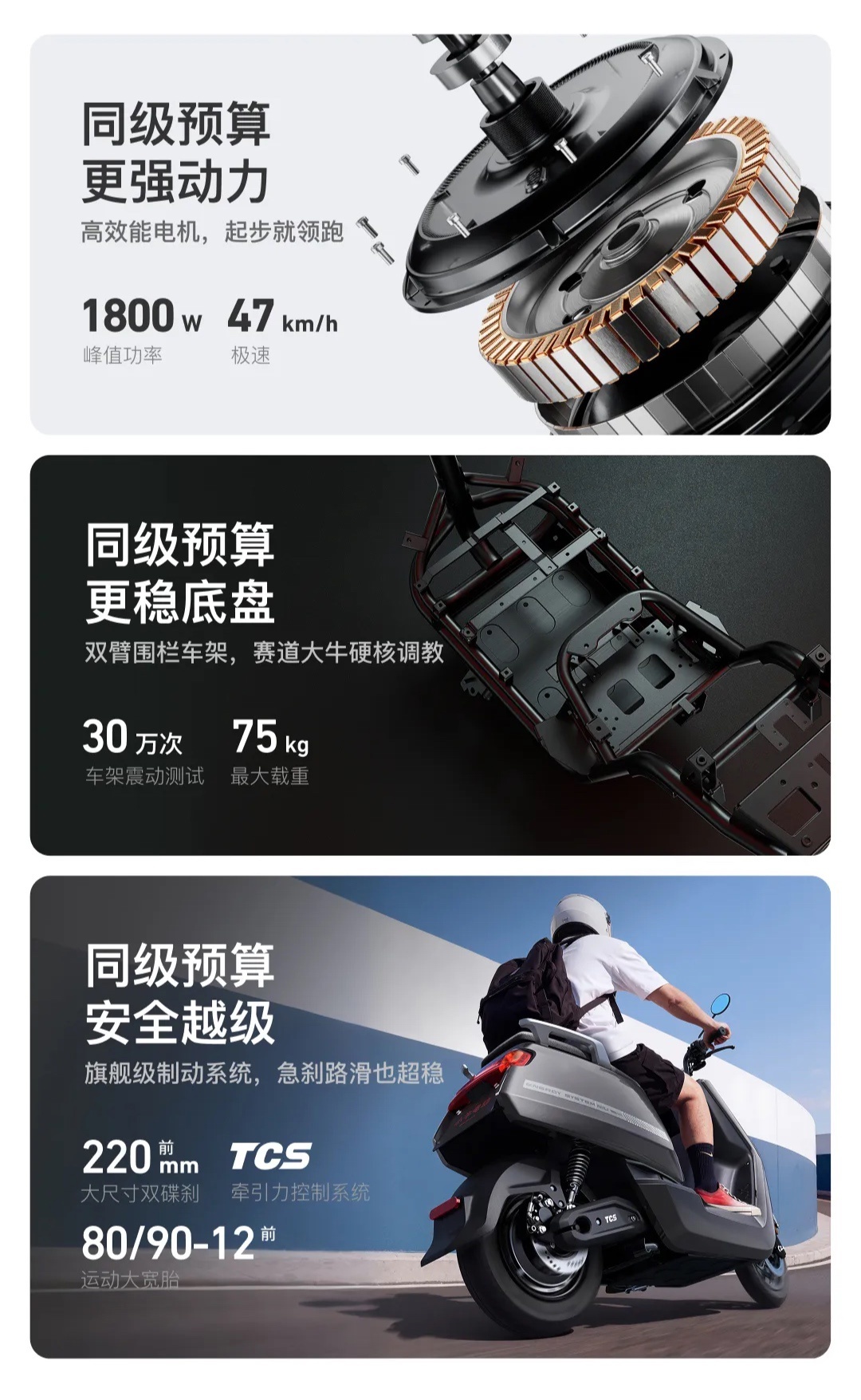 小牛 N One 有深空灰、星空黑、珍珠白三种颜色可选;电机峰值功率 1800W,极速 47km/h;最大载重 75kg,搭载双碟刹(前 220mm、后 180mm)。