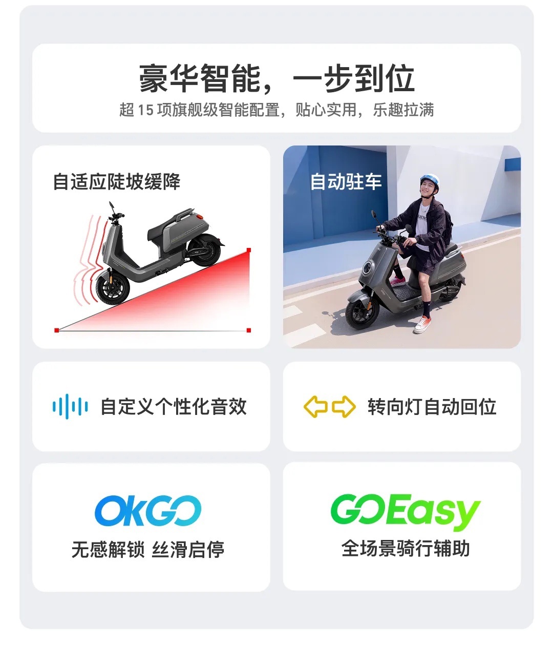 小牛 N One 搭载 60V 20Ah 铅酸电池,续航里程 48km,充电时间 7 小时;支持自适应陡坡缓降、自动驻车、自定义个性化音效、转向灯自动回位等功能。