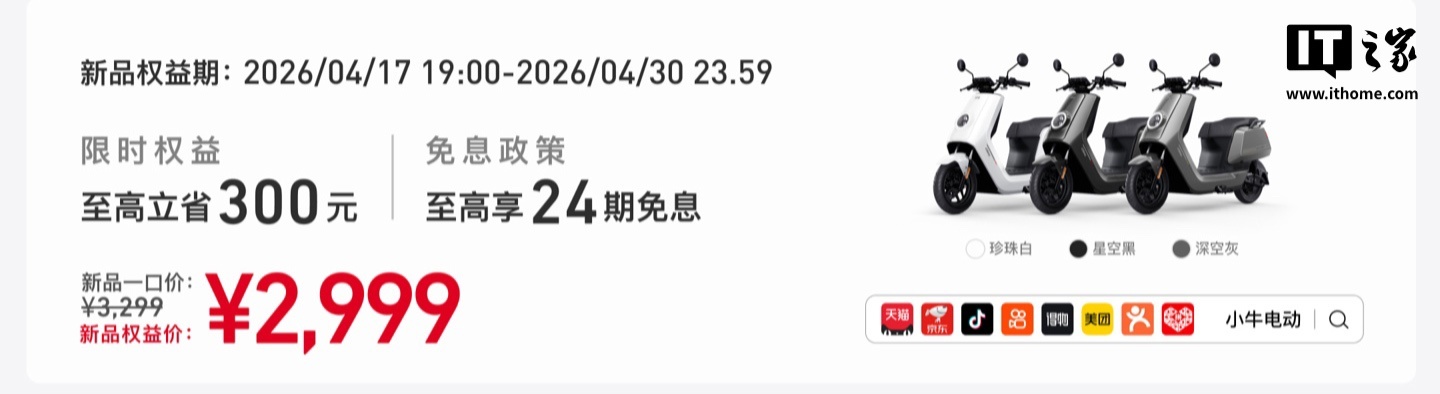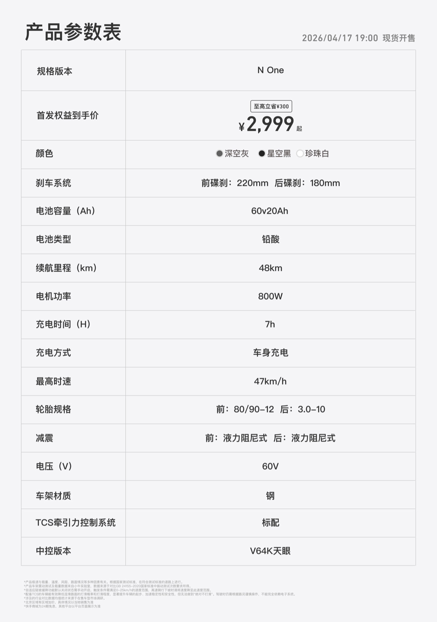 IT之家 4 月 17 日消息,小牛电动今日发布了小牛 N One 电动摩托车,4 月 17 日 19:00 正式开售,新品一口价 2999 元。