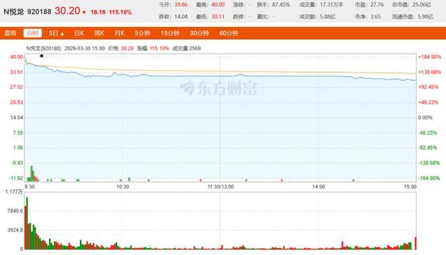 悦龙科技以14.04元/股发行,开盘即冲至39.86元/股,涨幅达183.90%。盘中最高触及40.00元/股,最低回落至30.11元/股,截至收盘报30.20元/股,较发行价上涨115.10%,实现翻倍以上收益。全天振幅70.44%,换手率高达87.45%,成交额5.875亿元,显示市场交投极为活跃。